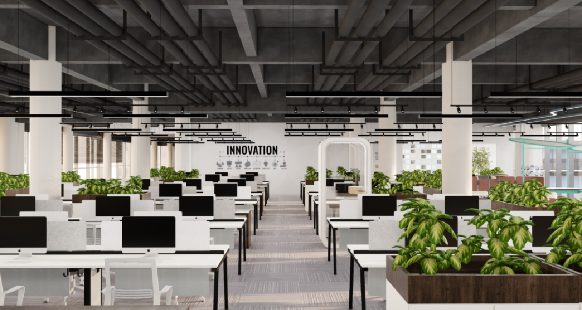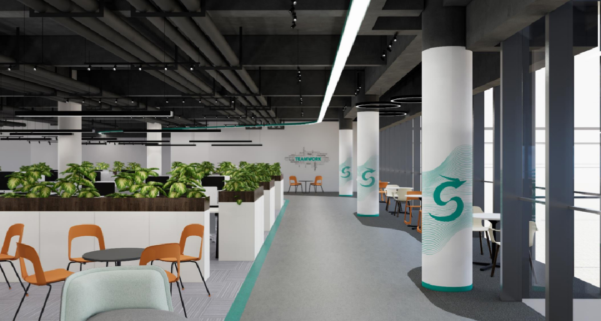 朗新集团总部大楼建筑主体为可持续自供给零碳建筑,本项目为二期办公区室内设计,设计方案用贯通内部大庭院的公共回廊将所有办公区域连接起来,呼应了朗新集团业务涉及的太阳能、储能、未来能源、再生能源四大板块,分别用科技黑、朝阳红、生机绿、IT蓝,将大楼室内分为四个主题区域,将新能源业务板块与建筑融为一体,也是朗新科技在推动绿色低碳发展、践行可持续发展方面的体现。